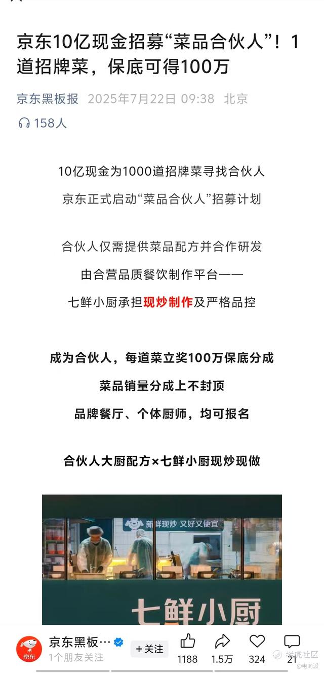 也是在同一天,京东同步启动“菜品合伙人”招募计划,计划投入10亿现金,为1000道招牌菜寻找合作伙伴,并计划在3年内开设10000家“七鲜小厨”门店。