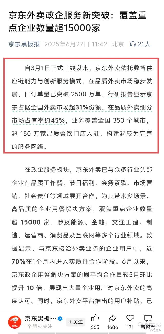 公开数据显示,截至6月27日,京东外卖的日订单量已突破2500万单,行研报告显示京东占据全国外卖市场超31%份额,品质外卖这个细分领域,市场占有率更是高达45%,业务触角已延伸至全国350个城市。