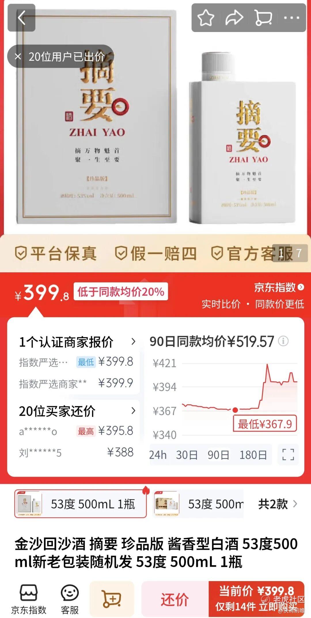 终端市场上,摘要酒零售价同样节节走低。大型电商平台上的珍品摘要单瓶成交价普遍在388~400元区间波动,快消前瞻在京东指数上检索发现,金沙摘要53度500ml目前价格只需要399元,90日内最低甚至触及367元。