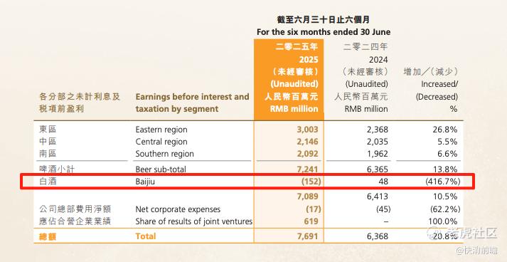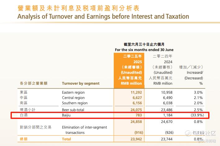 在啤酒主业稳健增长的对比下,白酒板块业绩可谓“拖后腿”,上半年首次出现经营亏损1.52亿元的情况(未计利息及税项)。正因白酒业务承压,华润啤酒2025年中期总营收同比下滑0.8%,这是自2020年以来首次营收下滑。