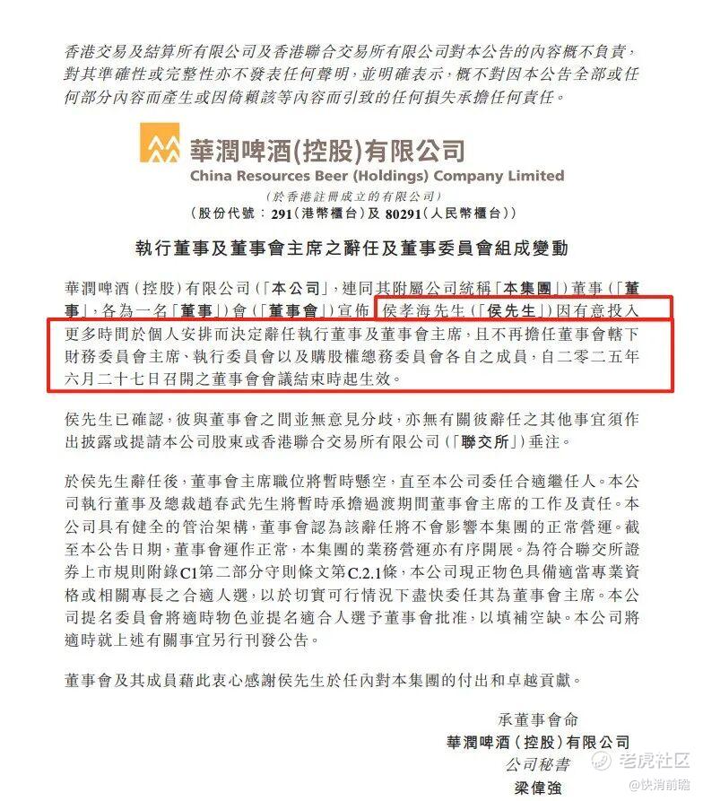 截图自华润啤酒公告
