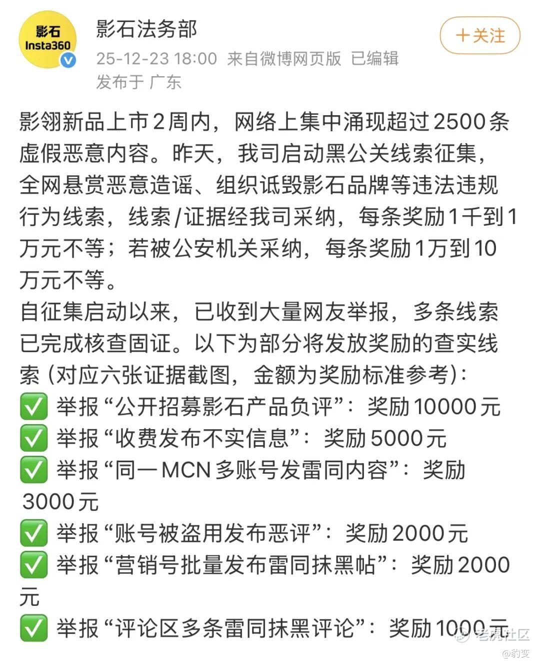 面对网络暗战,影石不得不展开反击,法务部公开发帖征集线索,线索或证据一经采纳,每条奖励1千到1万元不等;若被公安机关采纳,每条奖励1万到10万元不等。