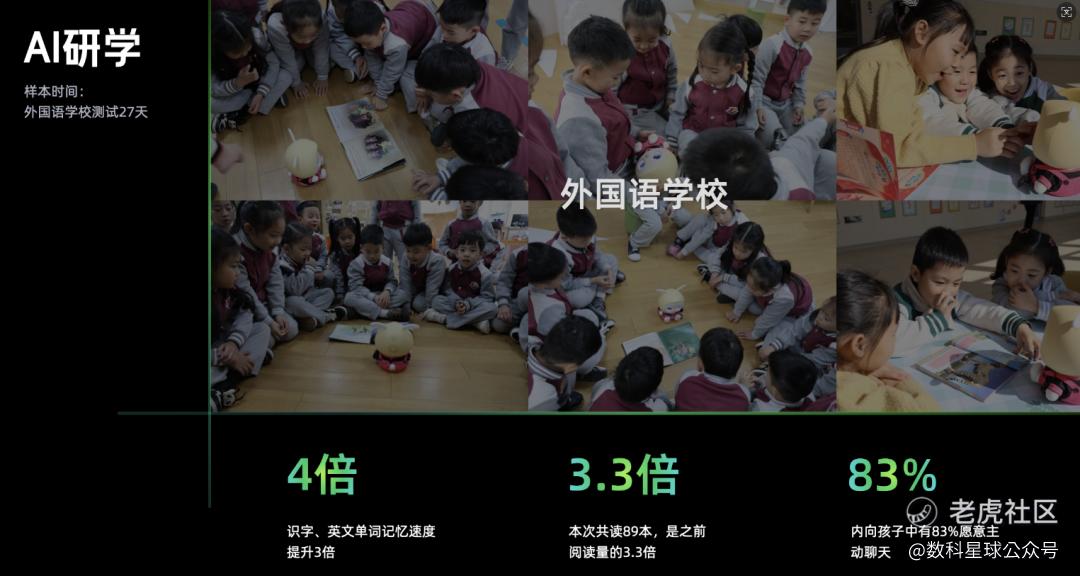 同时在线下实测场景,在与外国语学校的AI研学合作中,孩子们识字、记忆英文单词的速度提升至之前的4倍,阅读量提升至3.3倍。