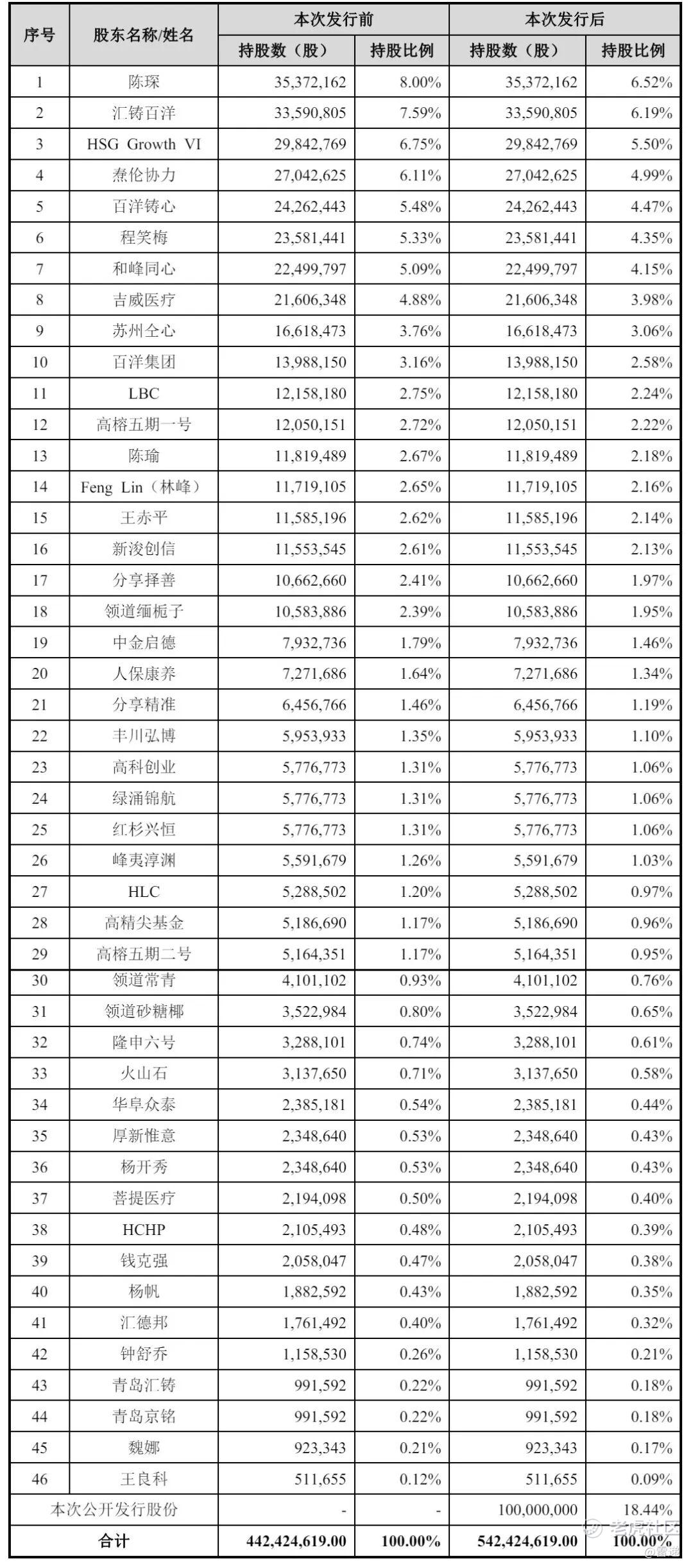 IPO前,LBC持股为2.75%,高榕五期一号持股为2.72%,Feng Lin(林峰)持股为2.65%,王赤平持股为2.62%,新浚创信持股为2.61%,分享择善持股为2.41%,领道缅栀子持股为2.39%,中金启德持股为1.79%,人保康养持股为1.64%,分享精准持股为1.46%,丰川弘博持股为1.35%;
