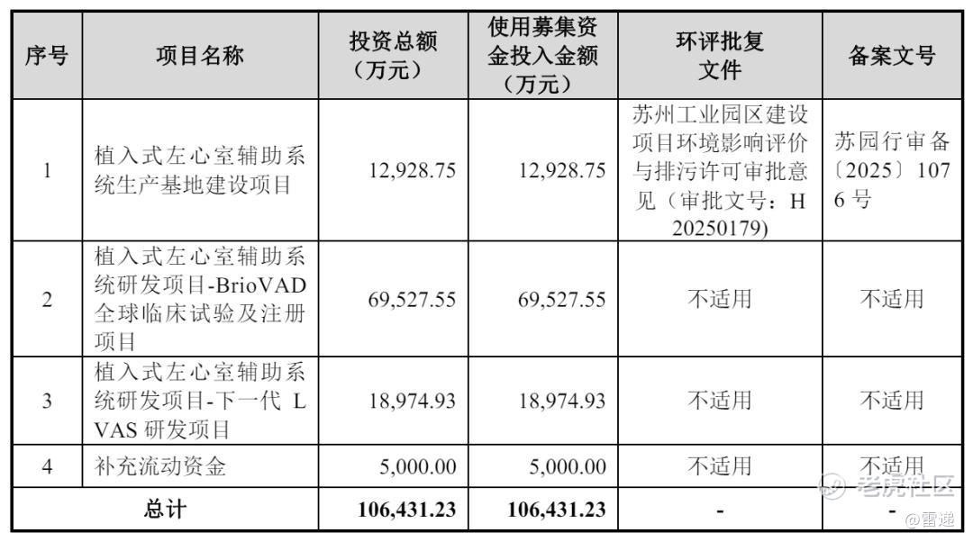 同心医疗计划募资10.64亿元,其中,1.3亿元用于植入式左心室辅助系统生产基地建设项目,6.95亿元用于植入式左心室辅助系统研发项目-BrioVAD全球临床试验及注册项目,1.9亿元用于植入式左心室辅助系统研发项目-下一代 LVAS 研发项目,5000万元用于补充流动资金。