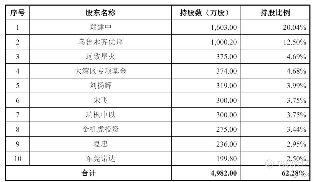 远致星火持股为4.69%,大湾区专项基金持股为4.68%,刘扬辉持股为3.99%,宋飞、瑞枫中以分别持股为3.75%,金机虎投资持股为3.44%,夏忠持股为2.95%,东莞诺达持股为2.5%,郑建南持股为2.05%。