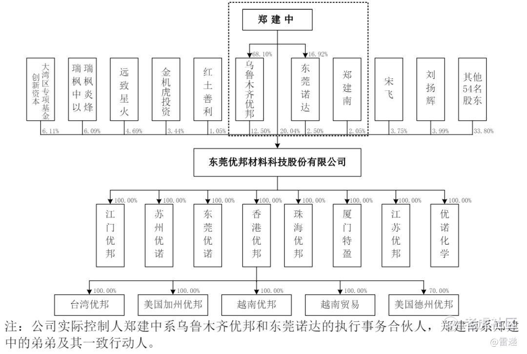 优邦科技实际控制人为郑建中,郑建中的弟弟郑建南系其一致行动人,郑建中系乌鲁木齐优邦、东莞诺达的执行事务合伙人,共控制37.09%股权。