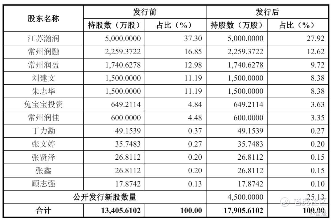 IPO后,江苏瀚润持股为27.92%,常州润融持股为12.62%,常州润盈持股为9.72%,刘建文、朱志华分别持股为8.38%,兔宝宝投资持股为3.63%,常州润佳持股为3.35%,丁力勘持股为0.27%,张文婷持股为0.2%,张贤泽、张鑫分别持股为0.15%,顾志强持股为0.1%。