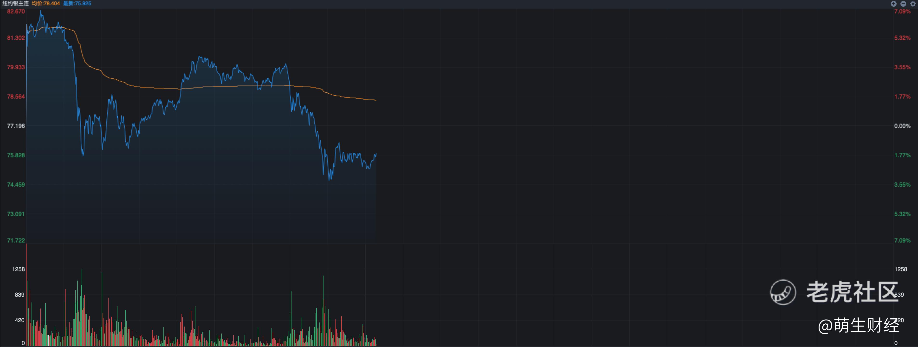 这只是国内白银基金的情况,而核心在外盘市场,今天早上7点开盘的纽约白银期货直接又大涨了7%,盘中最高到了82.67美元,不过8点之后便开始了盘中跳水,不仅之前的跌幅没了,而且还下跌了1.77%,这仅仅是早盘的情况,主要是到了下午14点,纽约白银期货开始了盘中的第二次跳水,从上涨3.55%一度跳水到了下跌3.55%,全天的振幅超过了10%。
