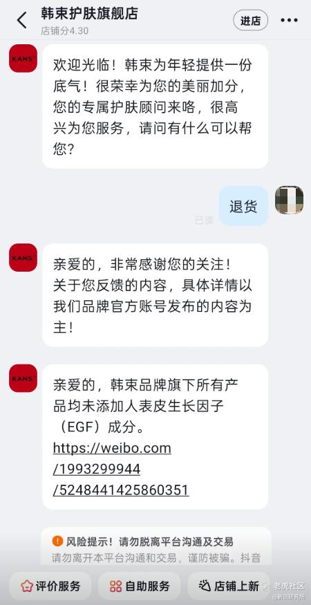 新识研究所就此事询问韩束护肤旗舰店铺,客服称:“韩束品牌旗下所有产品均未添加人表皮生长因子(EGF)成分,关于您反馈的内容,具体详情以我们品牌官方账号发布的内容为主。”