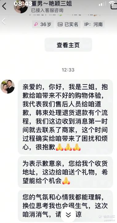 还有江苏的消费者陈女士通过主播“董男艳颖三姐”的直播间购买了韩束面膜,博主店铺承诺会跟官方实时沟通,处理好退货退款问题,并送出礼品以表歉意。