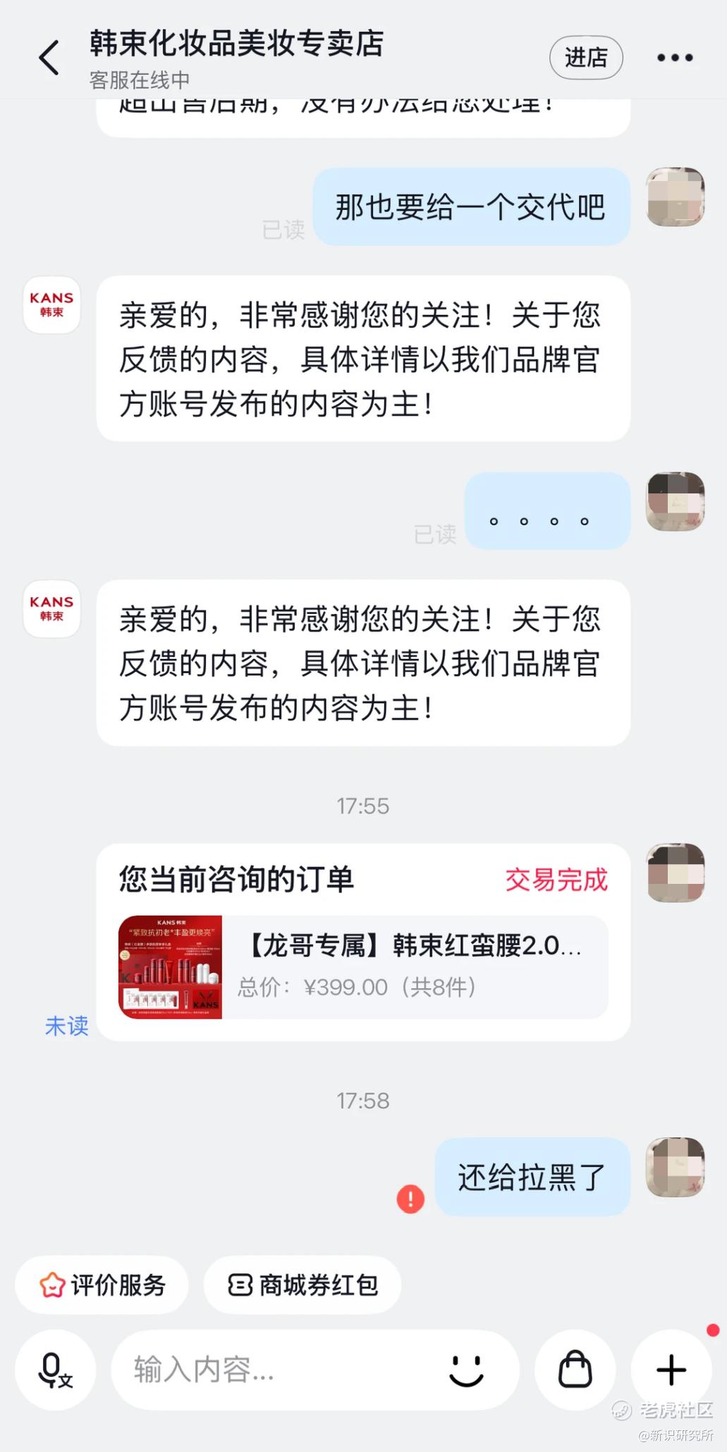来自上海的消费者刘女士向韩束化妆品美妆专卖店要求退货,客服表示已经商品超出售后期,没有办法处理,面对消费者的反复确认,最终选择了拉黑处理。