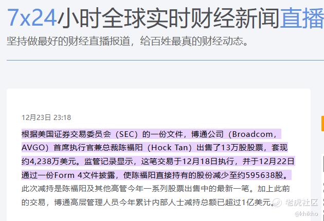 除了2笔大额买进的单,卖出端也有大动作。 $博通(AVGO)$的CEO,Hock Tan在12月22–24日分3批卖出 130000股,均价326.02美元,套现了4238万美元。12月27日《Financial Times》报道这个的时候,在这个文《Broadcom chief cashes in on 2023 chip rally》特意强调2023年 AVGO 股价已上涨 105%, 涨这么多,套现一些钱去过圣诞吗。[鬼脸]