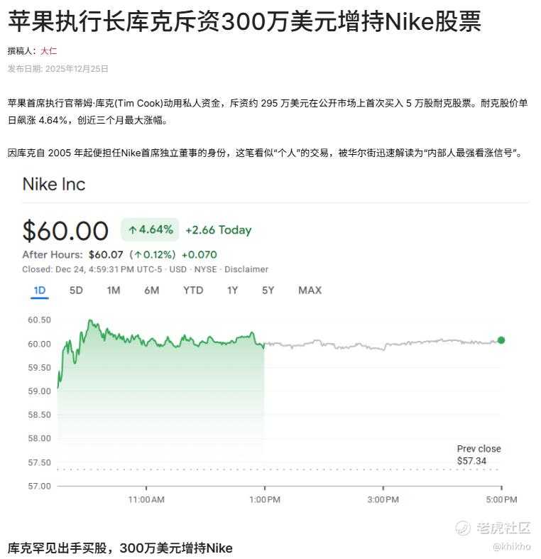 圣诞周到底发生了什么?2笔 $耐克(NKE)$ 的大单买入,Tim Cook不单是苹果的CEO,也兼任着Nike的独立董事,12月25日(美股周一休市,实际成交于12月24日盘后),以58.97美元买入50000股,总价294.85万美元,CNBC的新闻里的使用标题 “Cook rare open-market buy”。然后其他媒体也相继报道,在整个投资圈里引发了一波的大讨论。当天Nike收涨 4.6%多,成交量比20日均量放大了2.3倍。