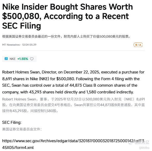 回到Nike的2笔大单买入,他们有两位独立董事连买,算不算“集群买入”?我们可以按刚才的那个标准来对照一下。首先,未达到3人门槛。我搜了很久,没有找到任何报道说这个月还有其他高管大手笔买进。