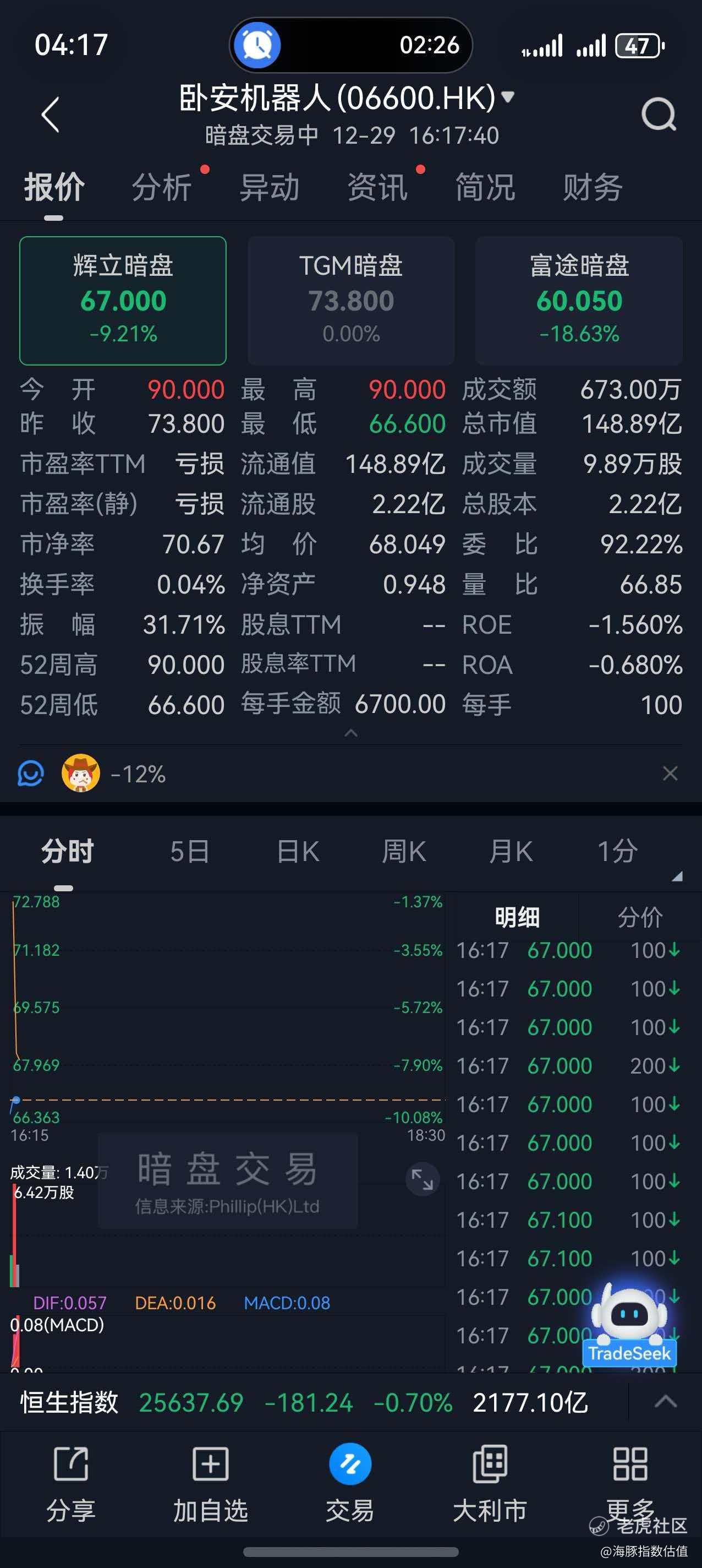 今天港股6只新股暗盘,很热闹。我打了其中3只,中了2只,卖的都不行。我中的是林清轩和窝安机器人,其中 $林清轩(02657)$ 确定性高一点。
