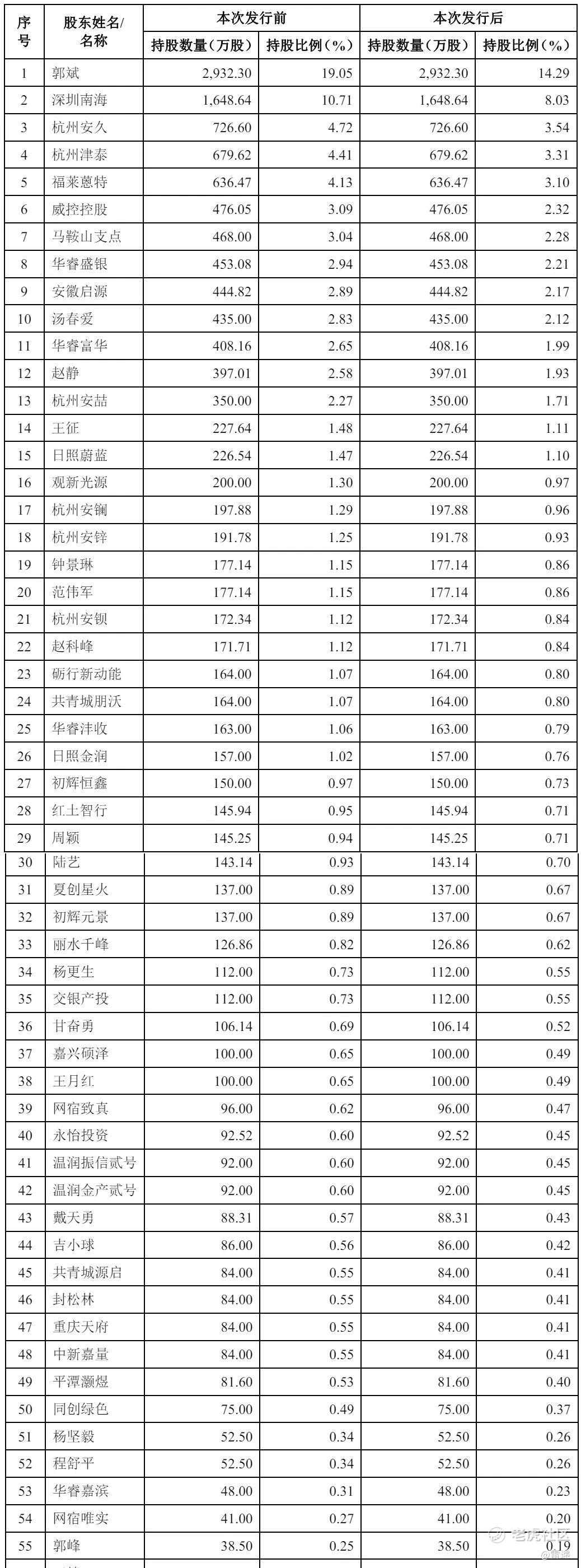 IPO后,郭斌持股为14.29%,深圳南海持股为8.03%,杭州安久持股为3.54%,杭州津泰持股为3.31%,福莱蒽特持股为3.1%,威控控股持股为2.32%,马鞍山支点持股为2.28%,华睿盛银持股为2.21%,安徽启源持股为2.17%,汤春爱持股为2.12%,华睿富华持股为1.99%,赵静持股为1.93%,杭州安喆持股为1.71%;