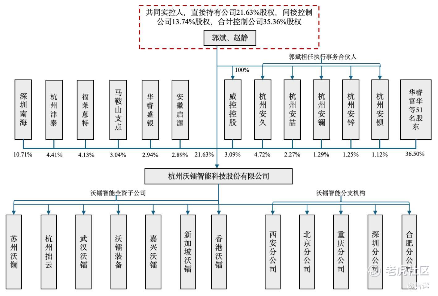 郭斌作为公司第一大股东,直接及间接控制公司32.79%股份(其中直接持股19.05%)。郭斌、赵静直接持有沃镭智能3,329.31 万股,占沃镭智能总股本21.63%;郭斌、赵静全资控股公司威控控股持有沃镭智能 476.05 万股,占沃镭智能总股本3.09%;郭斌直接持股并控制的沃镭智能员工持股平台杭州安久及杭州安喆分别持有沃镭智能726.60万股、350.00 万股,占沃镭智能总股本4.72%、2.27%;郭斌直接持股并控制的合伙企业杭州安镧、杭州安锌及杭州安钡分别持有沃镭智能197.88万股、191.78 万股及 172.34 万股,分别占沃镭智能总股本1.29%、1.25%及 1.12%。