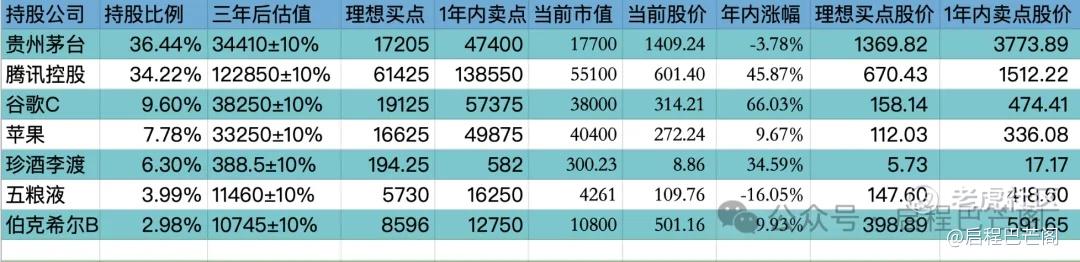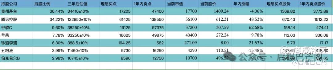 目前十大持仓:贵州茅台36.44%,腾讯34.22%,谷歌9.60%,苹果7.78%,珍酒李渡6.30%,五粮液3.99%,伯克希尔2.98%。目前九大持仓占比88%(其中科技股占比51.6%,白酒股占比46.7%;A股占比40.43%,港股占比40.52%,美股占比20.36%),还有12%观察仓和现金。