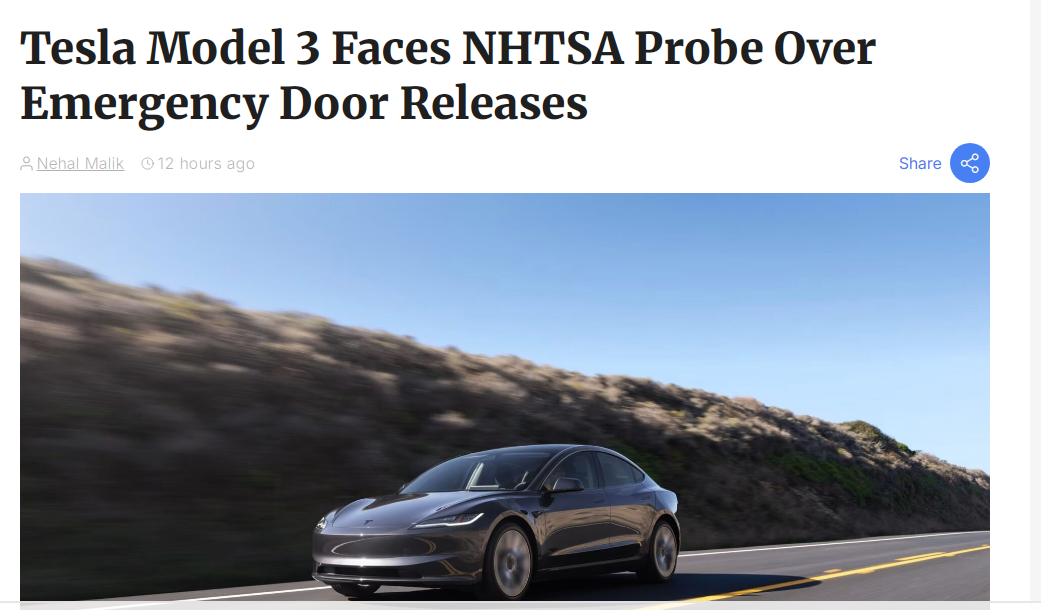 该调查目前处于“缺陷请愿”阶段,NHTSA将评估问题严重性,决定是否正式立案。不过,此前已经有多家媒体报道称,在一些致命车祸中,车内乘员或救援人员称因无法及时打开车门,导致延误救援。