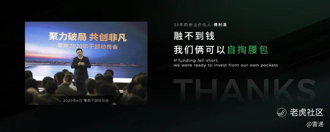 同时我也非常感谢傅总在15年支持我再次创业,创建零跑。特别是在2020年,新能源汽车行业迎来了低潮,融资极其困难,傅总在零跑骨干员工大会上给大家鼓劲,承诺在没有外部投资人投资的情况下,他和我两个人按比例出资,至少养活大家三年,极大的鼓舞了大家的斗志。