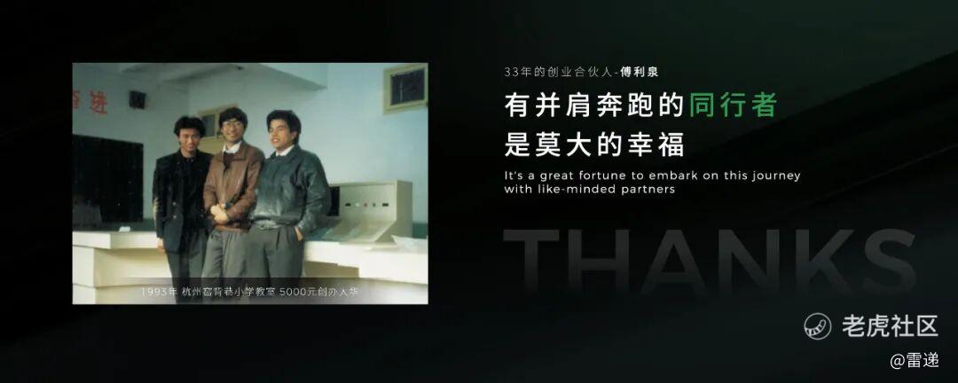 大家都知道新能源汽车是一个非常非常烧钱的赛道,股东、投资人的支持是非常重要的,在这里首先要感谢的是零跑的创始股东,也是我三十多年的创业搭档,大华股份董事长傅利泉先生,这张照片是三十三年前大华刚开始创立的时候拍的,地点是租用窑背巷小学的教室作为办公场地,在极端艰苦的环境下,大华从无到有,年销售额从几十万元一步一步成长到现在的几百亿元,成为全球安防监控行业的巨头,一路走来我们合作的非常好!应该是创业合伙人的典范!