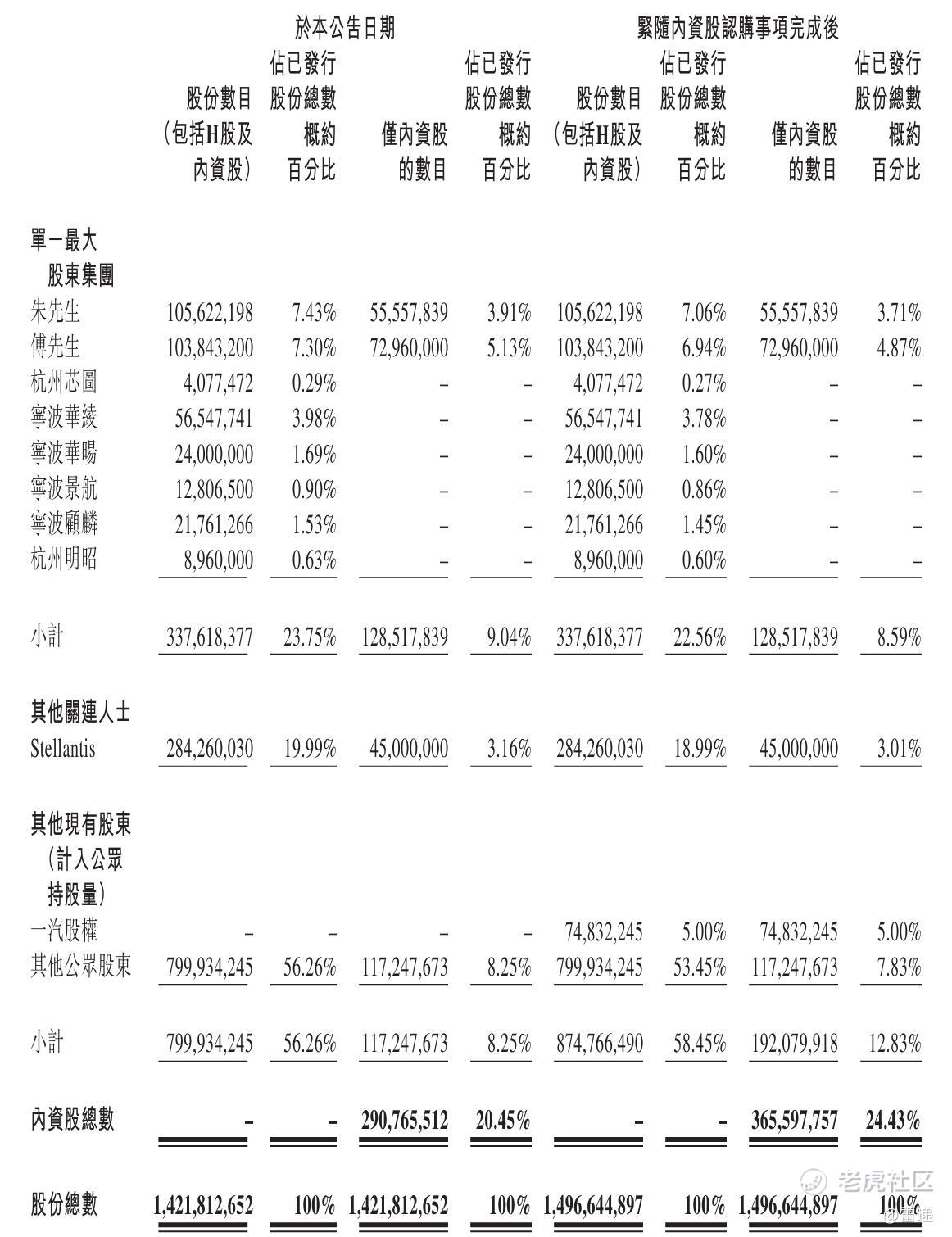 此次交易后,朱江明持股为7.06%,傅利泉持股为6.94%,宁波华绫持股为3.78%,宁波华旸持股为1.6%,宁波景航持股为0.86%,宁波顾麟持股为1.45%,杭州明昭持股为0.6%,杭州芯图持股为0.27%,外资股东Stellantis持股为18.99%,一汽股权持股为5%。