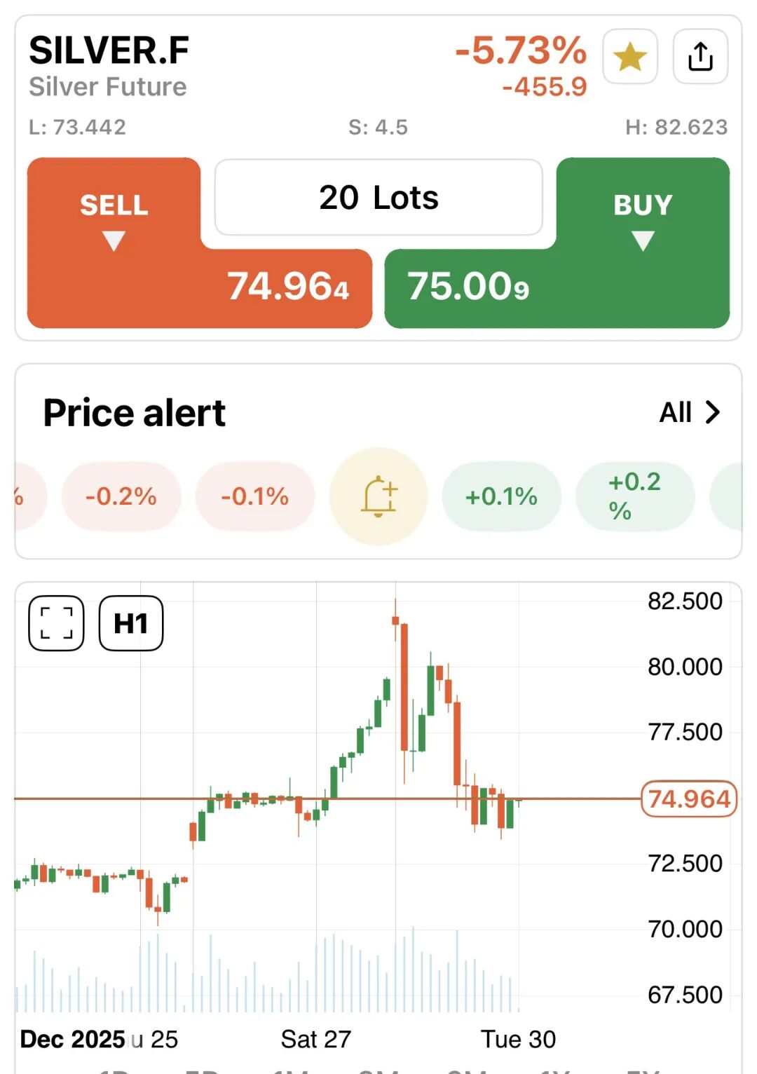白银今天如我们昨天预测展开回调。今天高开低走,最高$83.94,最低$73.96。