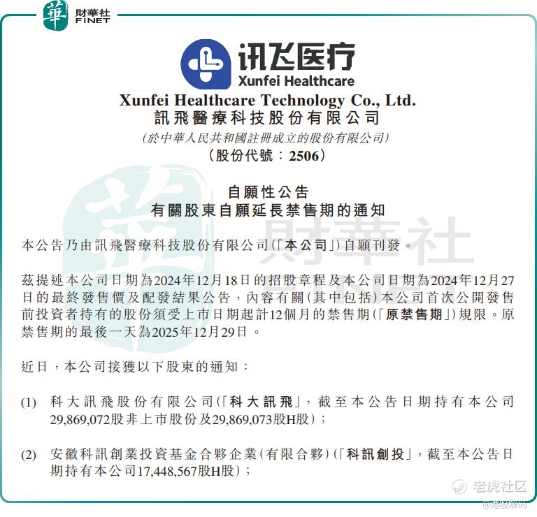 消息面上,12月29日,讯飞医疗科技发布重要公告,包括控股股东科大讯飞在内的八名主要股东,自愿将其所持公司股份的禁售期从原定的2025年12月29日延长至2026年12月29日。