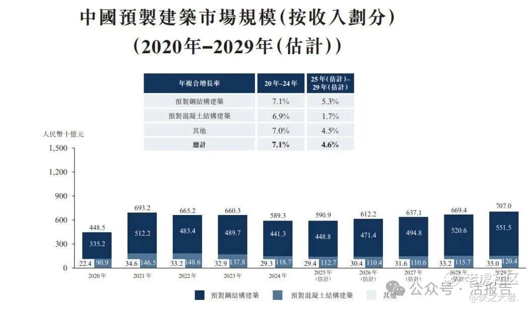 根据弗若斯特沙利文报告显示,于整个中国建筑行业中,预制建筑市场正处于快速发展阶段,2024年整体渗透率达到29.3%,较2020年的20.0%显著提升。随着国家"双碳"战略的深入推进和绿色建造标准的不断提高,预制钢结构建筑凭借其环保、高效、可循环利用等优势,在工业建筑领域的应用比例持续扩大。预计到2029年,中国预制建筑整体渗透率将达到35%以上,为相关企业创造了广阔的市场空间。