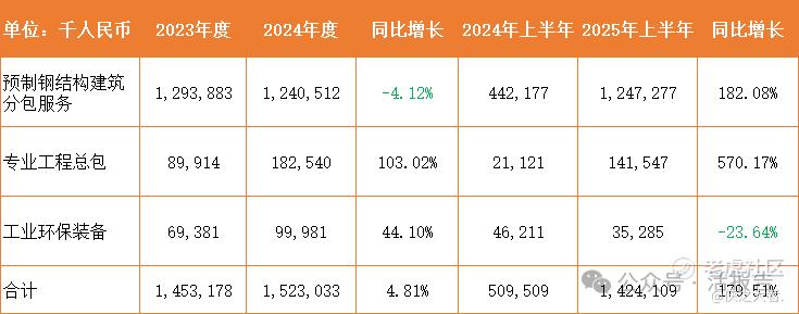 公司的主营业务清晰划分为三大板块,其中预制钢结构建筑分包服务为第一大支柱业务,2025年上半年贡献收入约12.47亿元,占总收入87.58%。该业务提供从设计、制造到安装的一体化解决方案,产品广泛应用于汽车制造、新能源、物流、现代农业仓储等工业场景,具备"工厂预制、现场快装"优势,即能有效缩短工期,还能降低综合成本。