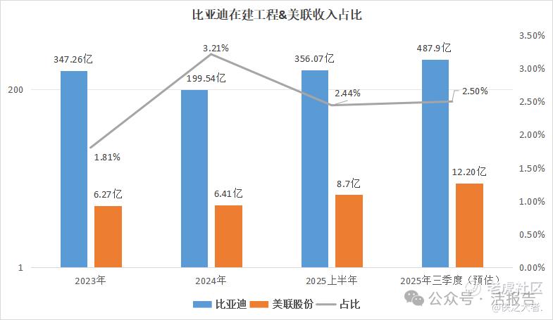 另外,根据比亚迪三季报财报显示,其在建工程约487.90亿人民币,同比上一年增长176.59%,环比半年报则新增131.83亿人民币;美联股份作为比亚迪的御用的预制钢结构建筑商,可预见其2025年来自于比亚迪的全年收入将随之水涨船高。