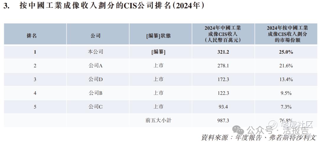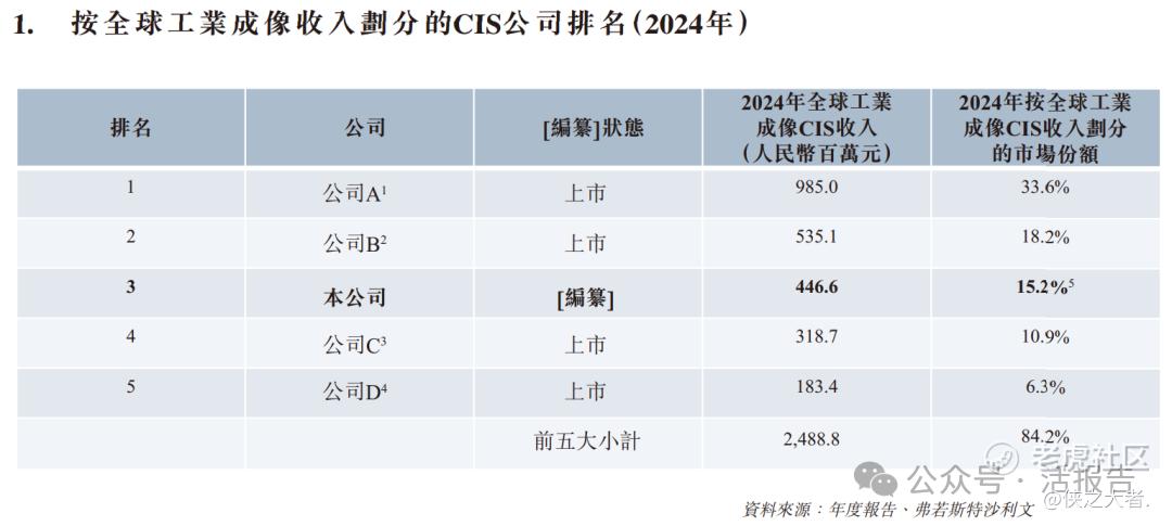于2024年按工业成像收入计,公司在全球CIS公司中排名第三,在中国CIS公司中排名第一,占全球市场份额的15.2%;