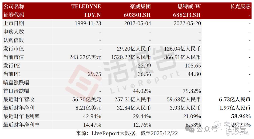 同行业IPO可比公司:TELEDYNE、豪威集团、思特威-W。