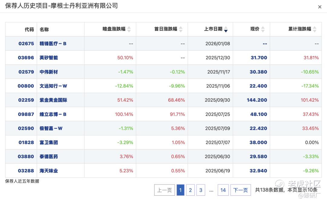 摩根士丹利历史上作为保荐人共参与135个项目,暗盘60家公司上涨,43家公司下跌,32家公司平盘,破发率为31.85%;上市首日78家公司上涨,44家公司下跌,13家公司平盘,破发率32.59%,胜率较为一般。摩根士丹利今年的参与了12个项目共有5个破发,破发率41.67%,不过摩根士丹利的国际机构资金覆盖强、定价配售与复杂项目执行能力成熟,仍然为不错的保荐机构。