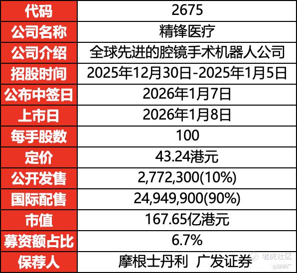 发行架构方面,精锋医疗采用机制B发行,公配固定10%,共有27,723手,并设有15%超额配股权;本次引入13家基石投资者,包括阿布扎比投资局、UBS、千禧及腾讯等。合计认购金额约7,500万美元,按发售价计算约占本次发行股份的48.7%,近五成由基石长期锁定,对上市初期股价稳定有一定支撑。联席保荐人为摩根士丹利及广发证券,摩根士丹利为老牌强大保荐人,而广发证券整体战绩较好,保荐团队实力不错。根据活报告资料,截至发文时港股通纳入门槛为93.18亿港元,按照发行价43.24港元计算,公司市值将达到167.65亿港元,有望纳入港股通。