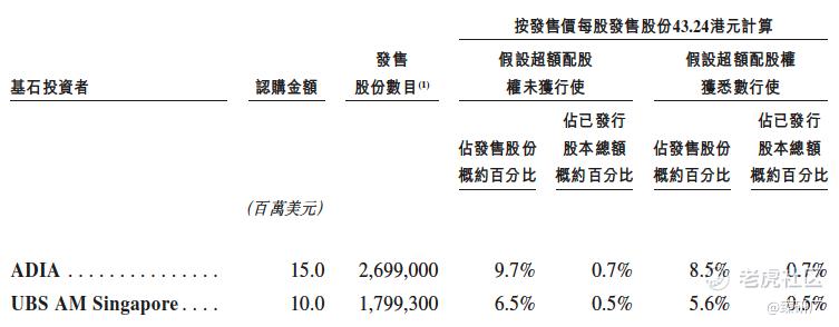 本次发行拥有13名基石投资者,合计认购7,500万美元,按发售价每股43.24港元,基石投资者认购的发售股份总数为13,494,600股,约占根据全球发售发行的发售股份的48.7%(假设超额配股权未获行使)。基石投资者包括ADIA、UBS、OrbiMed、LYFE、ICSA(Millennium)、华夏基金、Huang River Investment Limited(腾讯)、盘京基金、China Alpha等。