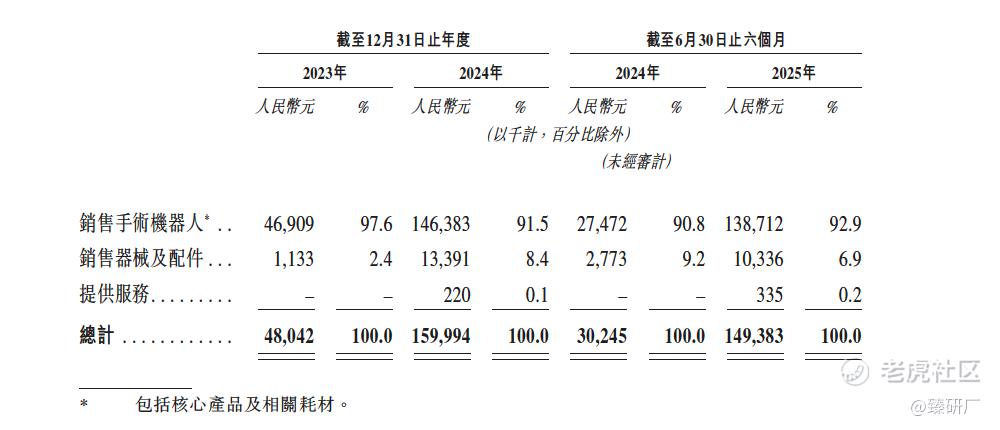 公司营收主要来源于销售手术机器人,其主要产品包括(i)精锋多孔腔镜手术机器人、(ii)精锋单孔腔镜手术机器人及(iii)精锋支气管镜机器人。2023年至2025年H1,精锋医疗的收入分别为人民币0.48亿元、1.60亿元及1.49亿元,2025年H1较2024年H1的0.30亿元同比增长1.19亿元,2024年H1—2025年H1同比增长率为393.9%; 结构上,公司收入以手术产品为核心辅以部分器械及配件:2023年—2015年H1核心产品收入分别为人民币0.47亿元、1.46亿元及1.39亿元,占同期收入的90%以上;器械及配件分别约占同期收入的2.4%、8.4%及6.9%。