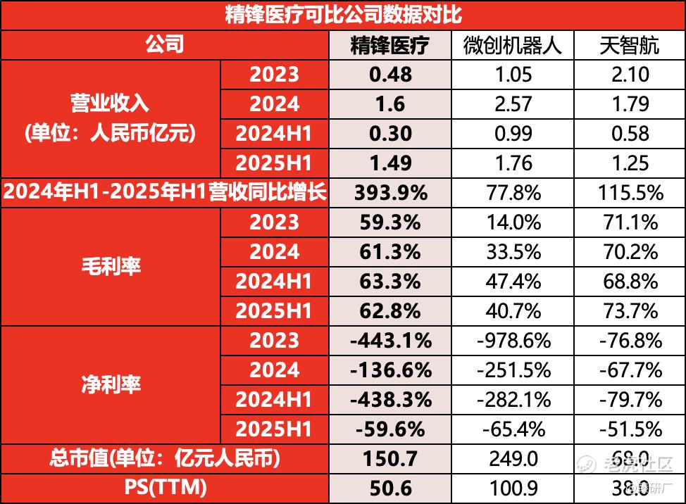营收方面,精锋医疗在2025H1的体量处于三者中游:期内收入1.49亿元,略低于微创机器人1.76亿元,但高于天智航1.25亿元,说明精锋在规模上已不落后于同类可比的主流区间。与此同时,精锋的增长弹性最突出:2025H1收入同比增加393.9%,显著快于微创机器人的77.8%与天智航的115.5%,体现其处于“放量加速期”;微创更偏“平台化扩张下的稳步爬坡”,天智航则处于“单赛道渗透提升的稳健放量期”。盈利质量上,精锋2025H1毛利率62.8%,高于微创40.7%、低于天智航73.7%,净利率-59.6%与微创-65.4%、天智航-51.5%接近,说明精锋在维持较高毛利的同时亏损已明显收敛,但后续仍需验证增速持续性以及回款与库存周转能否跟上放量节奏。