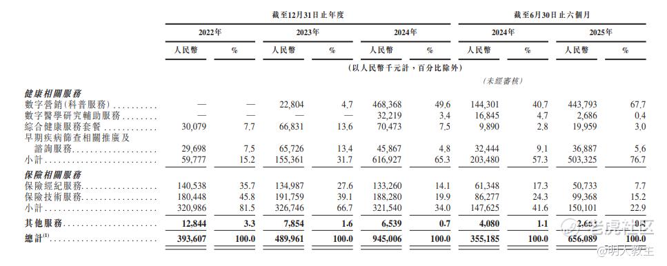 其余业务方面,轻松健康有点像 $平安好医生(01833)$ 和 $水滴(WDH)$ 的结合体。既有健康服务套餐、疾病早筛推广咨询等偏医疗服务的业务,也有保险经纪和保险科技方面的收入。