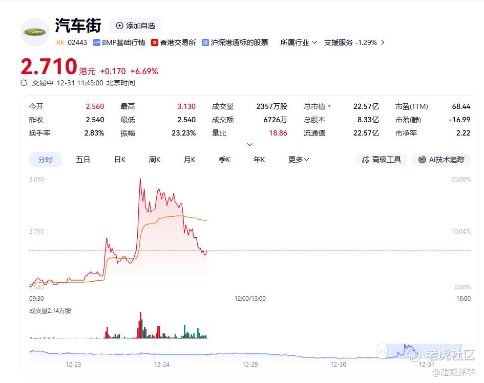 今天港股市场上,有只汽车股彻底火了——汽车街(02443.HK)盘中直接拉涨20%,成为低迷市况里难得的一抹亮色。一般这类突发大涨背后,往往藏着重磅行业信号,这次也不例外,核心原因就是汽车街和腾讯智慧出行正式达成了战略合作,这波操作堪称二手车行业数字化转型的里程碑事件。