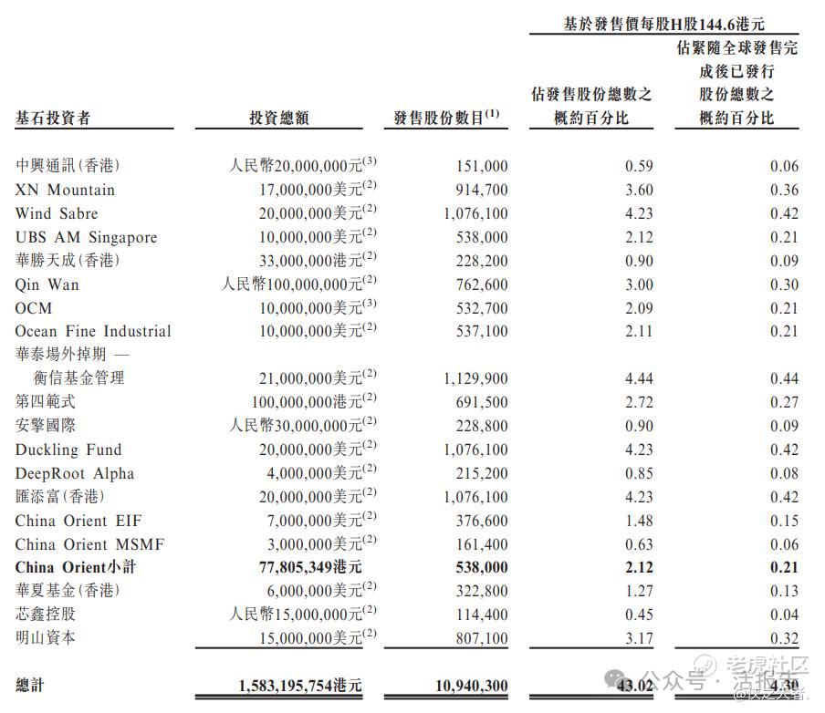 若按招股价144.60港元计,公司募资总额约36.77亿港元,该公司采用发行机制B,公开固定10%,无强制回拨;其中,国配部分约占33.1亿港元,其中有18家基石投资者参与,包括衡信基金、汇添富、Duckling Fund、明山资本、第四范式、华夏基金、中兴通讯等,合计参投约15.83亿港元,占全球发售的43.02%。