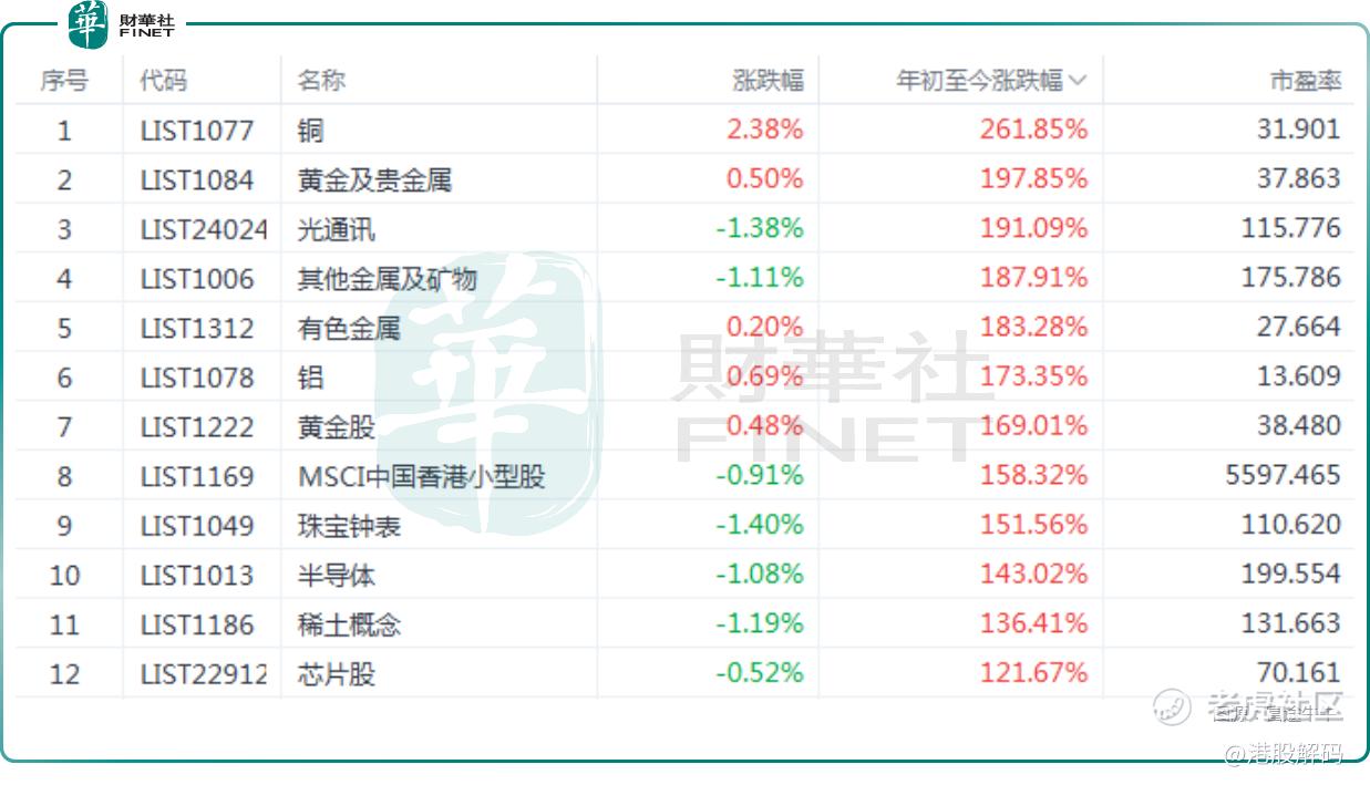 数据显示,截至12月31日,港股铜板块年内累涨261.85%,黄金及贵金属板块涨197.85%,其他金属及矿物板块涨187.91%,有色金属、铝、黄金股、稀土概念也都在年内实现翻倍上涨。