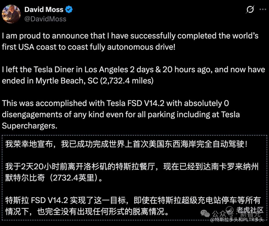 在2025年的最后一天,当全世界都在准备倒数跨年时,车主David Moss静悄悄地扔出了一枚深水炸弹——他驾驶搭载FSD V14.2的Model 3,完成了全球首次、经由第三方数据验证的「零接管」横贯美国之旅。