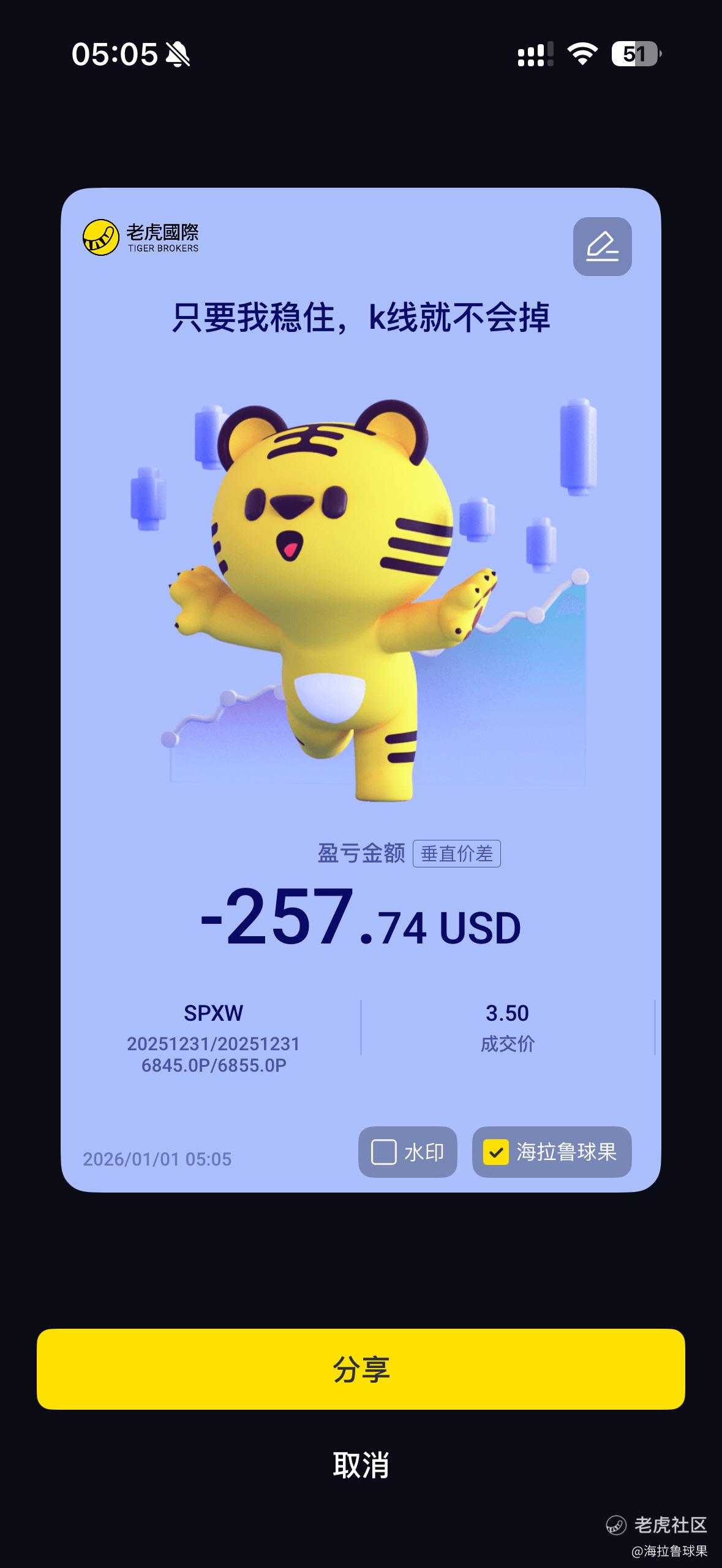 $标普500 垂直价差 251231 PUT 6850.0/PUT 6840.0$ 2026 年的底线就是不碰末日期权,自己没几斤几两。看着群里的人做心里痒痒,结果再次进入,赌徒心理哎。这东西没一点新手光环,稍纵即逝。盯着末日期权,还有一点就是会忽略自己的其他持仓状况。最大的新年愿望就是不要碰任何模拟期权,生理和心理实在受不了。