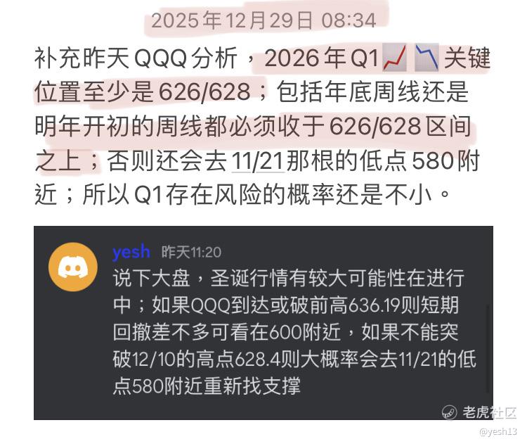 2026年希望在新的一年里与大家共同成长;昨天JPM的Q1指引有修正,目前看领式敞口从7195C下修至7155C的STO;从6515P下修至6475P的BTO;从5495P下修至5470P的STO;全面降低了Q1预期,提示Q1调整可能性提高下行风险加大。年底QQQ居然只收在613之上,连618都没守住更别谈新高趋势的626/628;开年看在这个位置上会有个反弹机会,大致能到12/26的高点附近,然后看再度回调,有机会去11/21那根的低点;贵金属方面:总体今年上半年趋势仍然向上;金子勿容质疑是各国央妈首选配置,GLD在395以下可逐步补或建;银子的实需和投机同步,55-57第一支撑区间,64-65第二支撑区间,二个区间都可以建或加(逐步进/第二支撑区间适合正股为主);