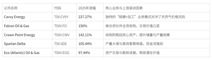 尽管2025年国际油价滑向近五年低点,基准布伦特与WTI原油全年跌幅超20%,但在多伦多证券交易所(TSX)及多交所创业板(TSXV),一批油气公司却上演了令人瞠目的逆袭。 在行业整体面临供应过剩、需求疲软的宏观逆风中,五只股票凭借独特的公司层面催化剂,实现了股价至少翻番的壮举,其中涨幅最高者年内飙升逾227%。本文将深度剖析这五只股价暴涨股票背后的核心逻辑。