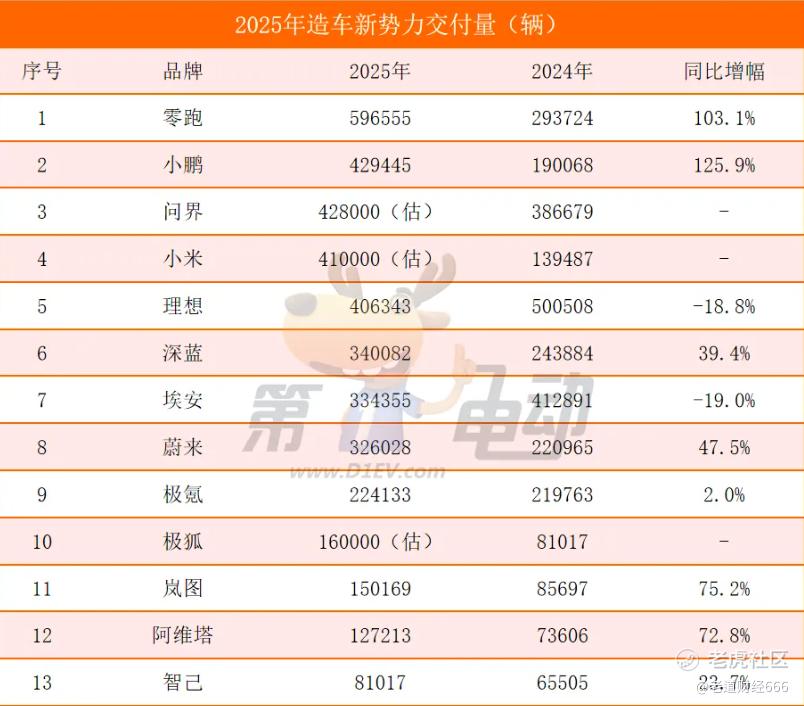 2025年,中国新势力造车圈彻底洗牌,成了格局重塑的关键一年。这一年,零跑汽车直接杀出重围——全年交付逼近60万辆,成为第一个年销量突破50万辆的新势力品牌,靠“全域自研+技术输出”这套新打法,开启行业新范式。另一边,小鹏也火力全开,销量翻倍猛追;但理想和埃安却有点“熄火”,增长明显踩了刹车。蔚来则强势回暖,重新找回节奏;岚图、阿维塔、极狐这些选手也快速冒头,势头很猛;再加上极氪回归吉利体系后,资源整合更顺畅,未来潜力不小。总之,各路玩家你追我赶,2026年的新势力战场,注定会更卷、更激烈!