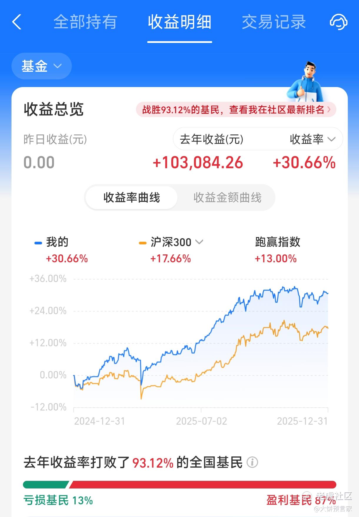 下面这个是2025年我的基金收益曲线,去年盈利10.3万元,收益率30.6%。同期沪深300上涨17.6%,跑赢大盘13%。