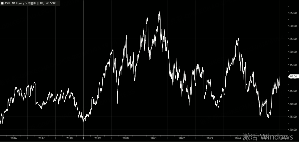 本轮AI带来的景气度,逼近上一轮,但从市盈率估值上看,阿斯麦目前为41倍,远低于历史高点的65倍: